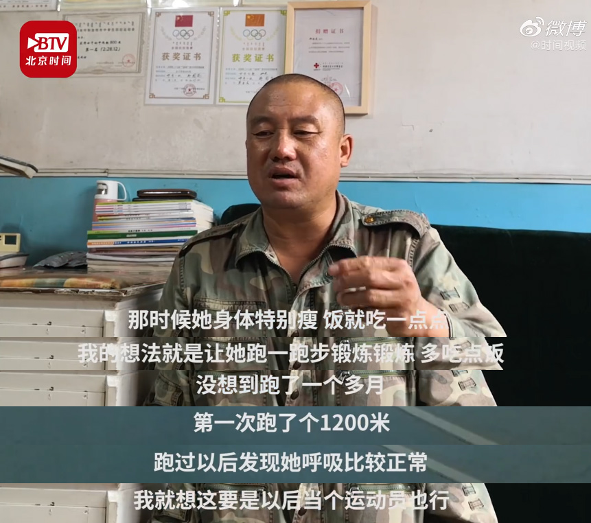 女孩儿今年17岁,坚持练习中长跑已经四五年了。她的体育成绩十分突出,屡破学校纪录。而这些成绩背后,是郑爸爸的全力陪伴与辛勤付出。